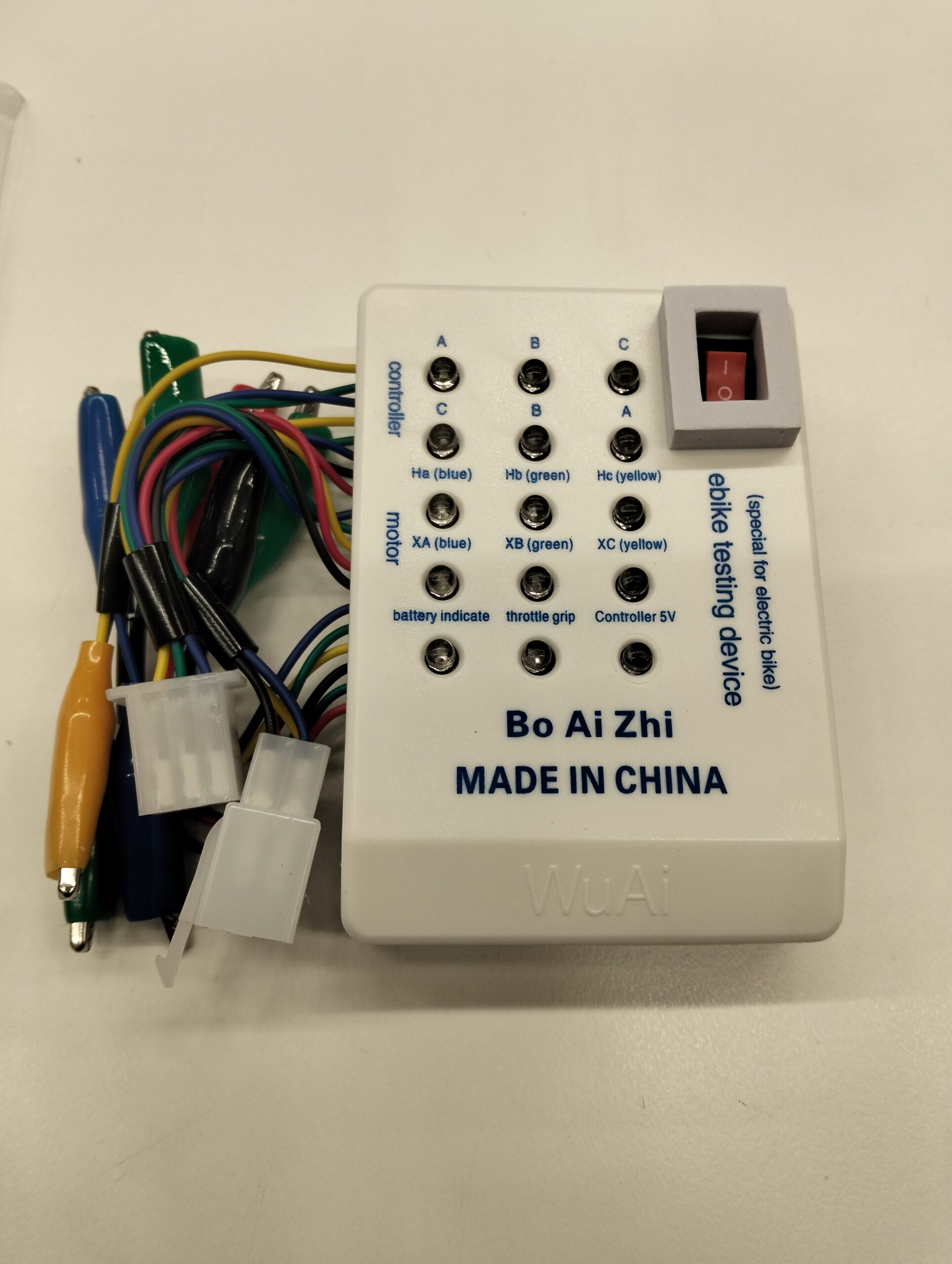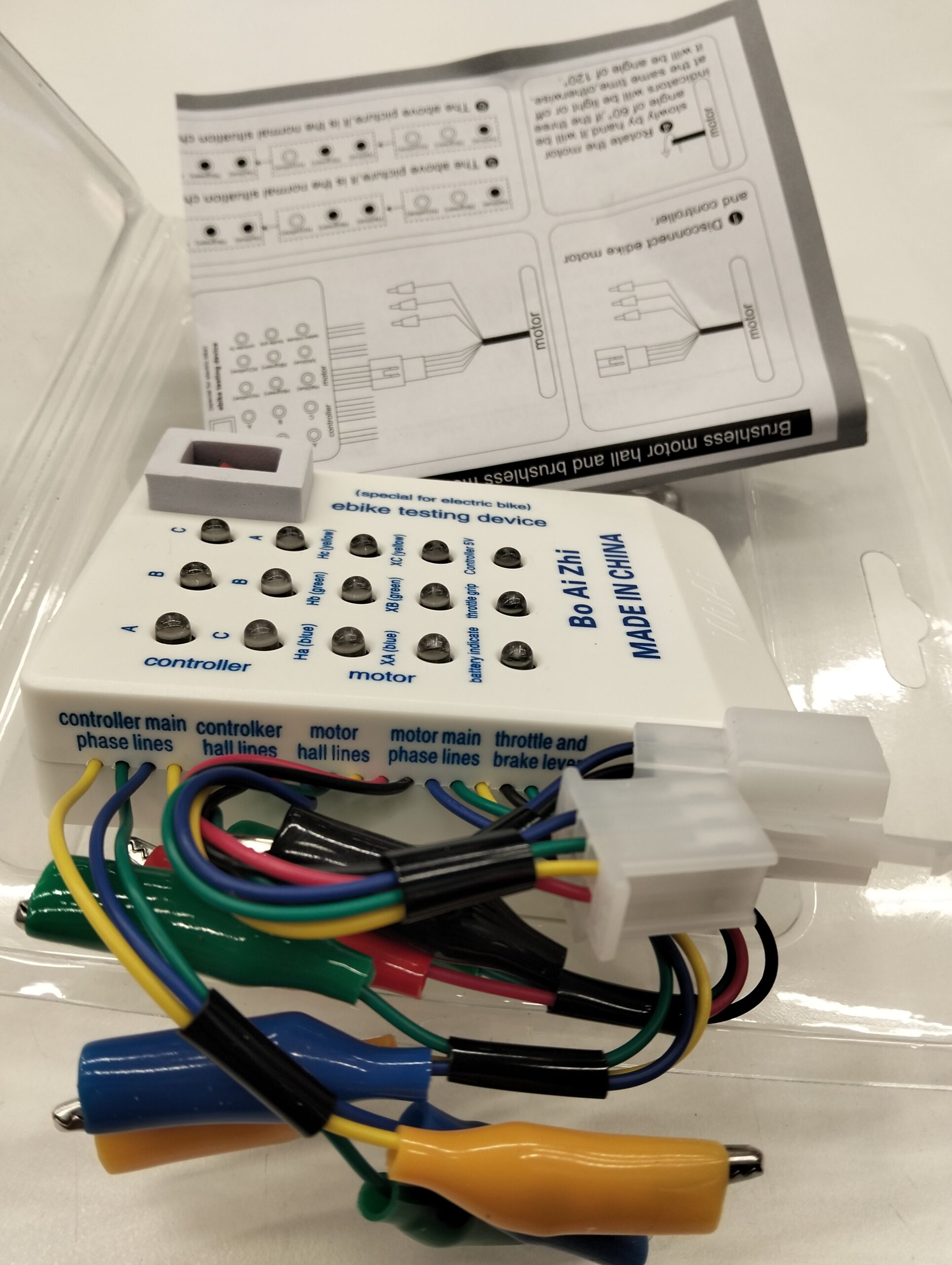 Sähkömenopelien testilaite. Tällä laitteella testaat kätevästi esim. moottorin hal-anturit, vaiheiden toiminnan ja kaasukahvan toiminnan. Pystyt myös testaamaan, onko moottorinohjaimen hal-linja ja vaiheet kunnossa. Toimii 9v. paristolla.